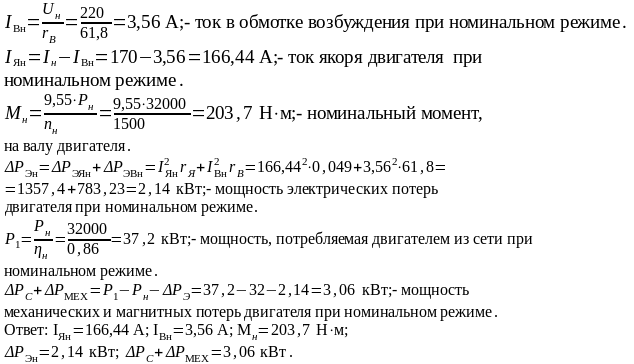 Для номинального режима определить ток в цепи якоря, ток в цепи возбуждения, мощность электрических потерь (включая цепь якоря и цепь возбуждения), мощность механических и магнитных потерь.