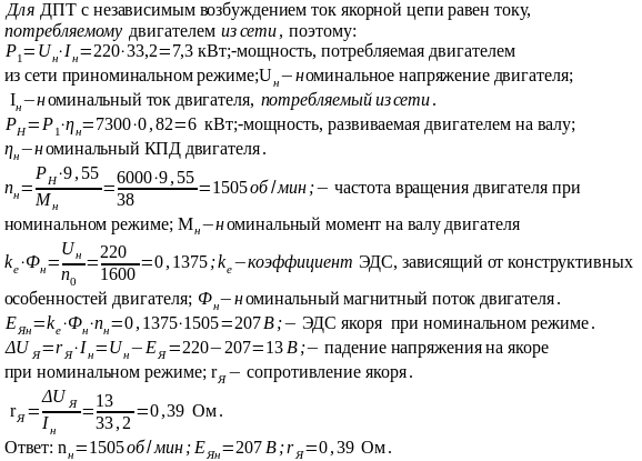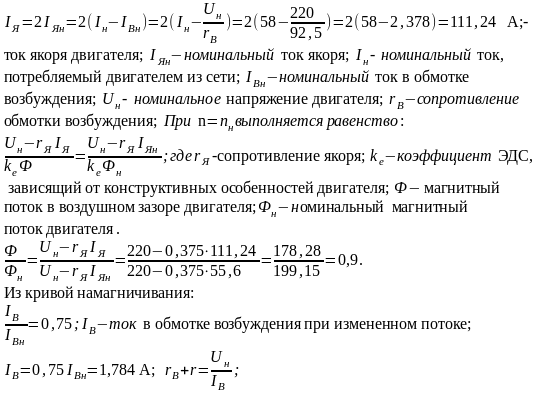 Двигатель постоянного тока с параллельным возбуждением имеет номинальные данные: мощность - Pн=10 кВт; напряжение на зажимах - Uн=220 В; ток потребляемый из сети Iн=58 A; номинальный КПД - ηн=78,5%; частота вращения якоря - nн=750 об/мин; сопротивление цепи якоря - rя=0,375 Ом; сопротивление цепи возбуждения - rв=92,5 Ом. Для расчета воспользоваться кривой намагничивания на рис. 15.