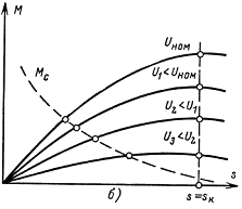 Критическое скольжение, не зависящее от напряжения, остается неизменным. Не изменяется также и синхронная угловая скорость, которая зависит только от частоты питающего напряжения и числа пар полюсов двигателя.