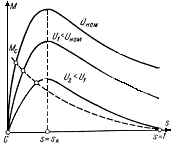 В случае ненасыщенной магнитной цепи машины максимальный момент при пониженном напряжении снижается пропорционально квадрату напряжения: