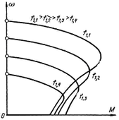 падает доля э. д. с. по отношению к приложенному напряжению вследствие относительного возрастания падения напряжения в сопротивлении статора с ростом нагрузки, что приводит к уменьшению магнитного потока, а, следовательно, к снижению электромагнитного момента. Как следствие убывания магнитного потока и абсолютного критического скольжения по мере снижения частоты падает максимальный момент и снижается жесткость механических характеристик (см. рис. 6.6).