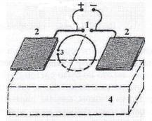 Рис. 2. Схема опыта Герца: 1 – искровой промежуток вибратора; 2 – пластины; 3 – искровой промежуток резонатора; 4 – проводящее или изолирующее тело