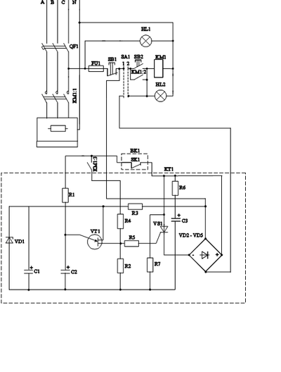 Установивши перемикач SA1 у роботу в автоматичному режимі, замикаємо вимикач QF1, при цьому харчування починає надходити в схему автоматичного керування. Загоряється сигнальна лампа HL2, що показує режим роботи.