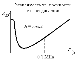 Электрическая прочность газа в сильной мере зависит от давления, если температура постоянна. При малых изменениях температуры и давления газа пробивное напряжение пропорционально плотности газа: