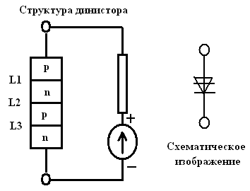 Динистор - это двухэлектродный прибор диодного типа, имеющий три p-n перехода. Крайняя область p называется анодом. Другая крайняя область n — катодом.