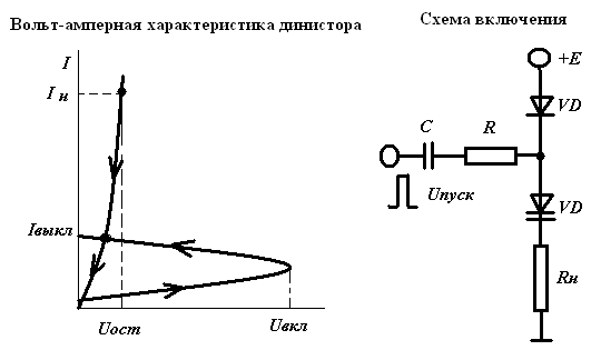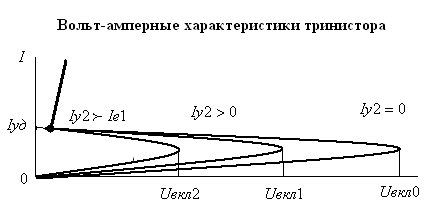 Вольтамперная характеристика тринистора отличается от характеристики динистора тем, что напряжение включения регулируется изменением тока в цепи управляющего электрода. При увеличении тока управления снижается напряжение включения. Таким образом, тиристор эквивалентен динистору с управляемым напряжением включения. После включения УЭ теряет управляющие свойства, следовательно, с его помощью выключить тиристор нельзя. Основные схемы выключения тринисторов такие же, как и для динистора.
