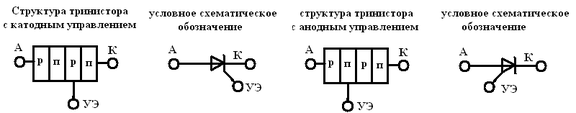 Тринисторы. В отличие от динистора тринистор имеет кроме выводов анода и катода ещё и управляющий электрод (УЭ). В зависимости от расположения УЭ тиристоры делятся на тринисторы с катодным управлением (вывод УЭ из зоны, прилежащей к зоне катода типа p) и с анодным управлением (вывод УЭ из зоны, прилежащей к зоне анода типа n).