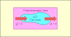 Изменение ΔU внутренней энергии неизолированной термодинамической системы равно разности между количеством теплоты Q, переданной системе, и работой A, совершенной системой над внешними телами