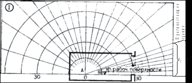 график I накладывается на чертеж поперечного разреза помещения, центр О графика I совмещается с расчетной точкой А, а нижняя линия графика – со следом условной рабочей поверхности,