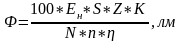 - коэффициент использования светового потока лампы, %, зависящий от типа лампы, типа светильника, коэффициента отражения потолка и стен, высоты подвеса светильника и индекса помещения