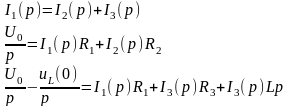 Для расчета токов и напряжения U1в операторной форме используем метод непосредственного применения законов Кирхгофа. Составим уравнения по 1-му и 2-му законам Кирхгофа в операторной форме: