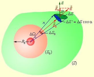 Рассмотрим конус с малым телесным углом ΔΩ при вершине. Этот конус выделит на сфере малую площадку ΔS0, а на поверхности S – площадку ΔS. Элементарные потоки ΔΦ0 и ΔΦ через эти площадки одинаковы. Действительно,