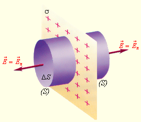 В этом случае гауссову поверхность S целесообразно выбрать в виде цилиндра некоторой длины, закрытого с обоих торцов. Ось цилиндра направлена перпендикулярно заряженной плоскости, а его торцы расположены на одинаковом расстоянии от нее. В силу симметрии поле равномерно заряженной плоскости должно быть везде направлено по нормали. Применение теоремы Гаусса дает: