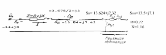 | Мощность поступающая на шины НН понижающей ПС | РНН = 13,632-0,28=13,352 | jQНН = 7,37-0,45=6,92 |