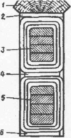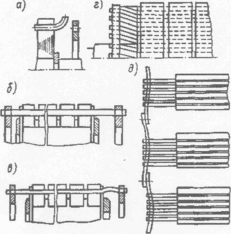 Извлечение обмотки с термопластической изоляцией производят в следующем порядке. Сначала ножом, зубилом или ножницами удаляют бандажи, скрепляющие катушки между собой и с бандажным кольцом. Затем выбивают клинья 1, разогревают обмотку. Доя этого несколько катушек соединяют последовательно между собой и пропускают по ним постоянный ток. Для этих целей можно использовать сварочные генераторы постоянного тока. Сила тока не должна превышать 0,3—0,4 от номинатьного тока. Температура нагрева должна быть не более 100—ПО °С. Форсировать нагрев во избежание вспухания изоляции катушек не следует. Нагрев продолжается 15—30 мин. Нагретые катушки достают из пазов, используя различные приспособления. После этого снимают прокладку под клином 2, достают катушку 3 и снимают прокладку 4. Нижнюю сторону 5 и прокладку 6 вытаскивают после того, как поднимут из паза столько верхних сторон, сколько пазов в шаге. При этом стараются, чтобы катушка как можно меньше потеряла свою форму и не повредилась изоляция.