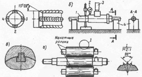 При наплавлении электросваркой для уменьшения коробления пала наплавляемые валики располагают параллельно оси, и каждый последующий валик накладывают диаметрально противоположно предыдущему. Места, имеющие уступы, стачивают на конус для уменьшения возможных термических напряжений (рис. 7-1, а). После наварки вал обрабатывают на токарном станке и шлифуют. При обработке вала необходимо обеспечить соосность поверхности выходного конца вала, шеек под посадку подшипников и поверхности под посадку сердечника, а если наплавка производится с сердечником, то необходимо обеспечить соосность с наружной поверхностью сердечника.