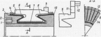 Рис. 12-2. Коллектор на стальной втулке: 1 — гайка; 2 — стопорный вннт; 3 — передний конус; 4 — бандаж; 5 — коллекторные пластины; б, 8 — манжеты; 7 — изоляционное кольцо; 9 — петушки; 10 — задний нажимной конус; 11 — ленточные петушки; 12 — обмотка; 13 — прорези для установки обмотки; 14 — изоляционные прокладки между коллекторными пластинами
