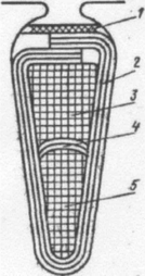 Рис. 11-4. Полузакрытый паз якоря с двухслойной обмоткой из круглого провода: 1 - клин; 2 -корпусная .изоляция; 3 - верхняя катушка об мотки; 4 - прокладка между слоями; 5 -нижняя катушка обмотки