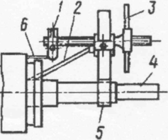 Рис.8-3.Приспособление для извлечения стержней из пазов ротора и распоркой 2. Конец извлекаемого стержня 6 закрепляют в зажиме 1, установленном на винте. При вращении гайки 3 винт вытягивает стержень из паза сердечника. Таким образом разбирают верхний и нижний ряды.