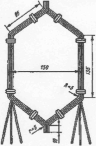 После гибки временный бандаж снимают, устанавливают изоляцию между слоями лобовых частей 1 1 и бандажируют ее. В пазы между слоями помещают прокладку 9. Затем с другой стороны заводят стержни верхнего ряда. В каждый паз забивают пазовые клинья 7 и изгибают лобовые части такими же приемами, как и стержни нижнего ряда. Верхние и нижние стержни соединяют хомутиками 14. К трем стержням нижнего ряда, являющимся началом фаз, хомутиками присоединяют три кабеля, которые выводят через три наклонных отверстия и центральное отверстие вала для соединения с контактными кольцами. Три верхних стержня, являющихся концами фаз, соединяют в звезд}' с нулевой шиной