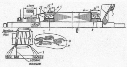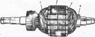 На лобовые части накладывают шнуром бандаж (на рисунке не показан); выводы обмотки припаивают к коллекторным пластинам и якорь пропитывают в лаке. Перед сушкой салфетками удаляют лак с вала и коллектора. После пропитки коллектор протачивают, продораживают (при необходимости) и якорь балансируют.