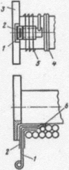 Затем подбирают намоточный провод и начинают намотку. Конец провода на длине 5 мм зачищают от изоляции и облуживают припоем ПОС-30. В пазы каркаса устанавливают узкопроводящие клеммы и припаивают к ним конец облуженного провода. Место пайки изолируют полоской изоляции. В том случае, когда каркас не имеет токопроводящих клемм, вывод делают монтажным проводом. Для этого монтажный провод и провод намотки спаивают, место пайки изолируют и монтажный провод прибандажируют нитками к гильзе катушки, вывод можно также сделать флажковый (рис. 17-3). Сделав вывод, каркас устанавливают на намоточный станок и производят намотку катушки.