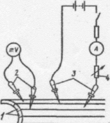 В качестве источника тока удобно применять батарею аккумуляторов, но можно также использовать сеть напряжением 110 и 220 В постоянного тока. Для уменьшения силы тока последовательно с якорем включают реостат 4, позволяющий регулировать салу тока. Для измерения падения напряжения следует пользоваться милливольтметром с соответствующим пределом измерений. В случае необходимости падение напряжения можно отрегулировать путем изменения силы питающего тока посредством реостата.