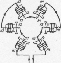 В собранном индукторе проверяют правильность чередования полярности полюсов. Схема проверки правильности чередования полярности главных полюсов с обмоткой возбуждения показана на рис. 14-1. К выводам HI—Н6 обмотки подключают постоянный ток.