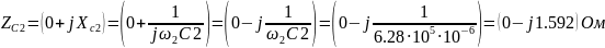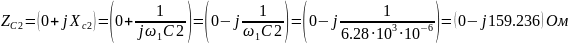2.3 Розрахунок комплексного еквівалентного опру (Z=Zекв.) заданої схеми як послідовне з`єднання елементів Z2 та C2 і відповідно послідовне з`єднання комплексних опорів Z2 та ZC2 :