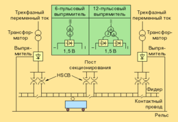Далее электроэнергия к объектам электрифицированной железной дороги поступает различными путями в зависимости от рода тока. Если тяга на постоянном токе, то на тяговой выпрямительной подстанции напряжение воздушных линий 110 – 220 кВ снижается приблизительно до 2,5 кВ, выпрямляется, сглаживается и при постоянном напряжении 3,0 (3,3) кВ передается по контактной сети, откуда питается подвижной состав. При этом вторым полюсом системы электроснабжения являются рельсы.