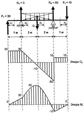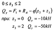 действующие силы: q = 20 кН; F= 30 кН; F=10кН.