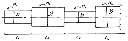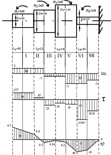 Ступенчатый стальной брус круглого поперечного сечения жестко заделан одним концом и нагружен. как показано на рисунке. Построить эпюры крутящих моментов. максимальных касательных напряжений и углов поворотов поперечных сечений. Проверить прочность бруса при [τk] – 60Мпа.