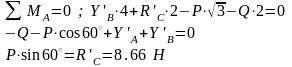 Fкy=0 Ya-P*cos45-Q+Rc*cos45=0