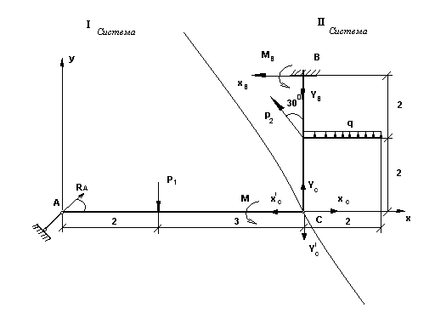 Рассмотрим систему уравновешивающихся сил, приложенных к конструкции. Действие связей на конструкцию заменяем их реакциями (рис. 2): в схеме а — XА, YА, YВ в схеме б — Y’А, Y’В и RC , в схеме в — Y”А , RC , RD. Равномерно распределенную нагрузку интенсивностью q заменяем равнодействующей