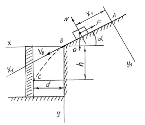 Рассмотрим движение камня на участке АВ. На него действуют силы тяжести G, нормальная реакция N и сила трения F. Составляем дифференциальное уравнение движения в проекции на ось X1: