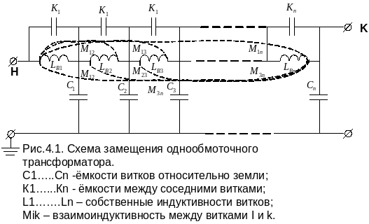 Так как провод высоковольтной обмотки трансформатора имеет очень большую длину (сотни метров и даже километры), переходной процесс в обмотке, так же как и переходной процесс в длинной линии, должен иметь волновой характер. Схема замещения обмотки трансформатора рис. 1. в отличии от линии может бать представлена цепочкой, число звеньев которой равно числу витков обмотки. По сравнению с отрезком линии в этой схеме появляются два новых параметра – взаимная индуктивность между отдельными соседними витками; цепочечные схемы при теоретическом анализе часто заменяют цепями с распределёнными параметрами, что при большом числе звеньев не приводит к существенным погрешностям.