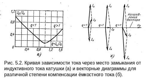 На рис. 5.2. приведены зависимость остаточного тока от индуктивного тока катушки и векторные диаграммы для типичных случаев. Область слева от точки минимума, где