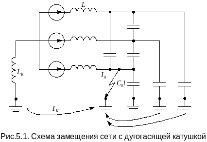 Одним из наиболее распространённых средств уменьшения (компенсации) тока замыкания на землю является включение в нейтраль регулируемого реактора (рис.5.1.), который называют так же дугогасящей катушкой, катушкой Петерсена, настроенной индуктивностью.