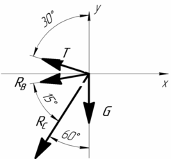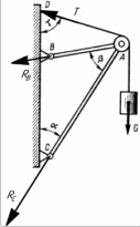 Груз силой тяжести G=350 Н удерживается тросом, перекинутым через блок А, ось которого укреплена на стержнях АВ и АС. Определить силы реакции в стержнях, если углы на рис.8.1 равны, соответственно: α=60º, β=15º, γ=30º. Рисунок не выдержан в масштабе.