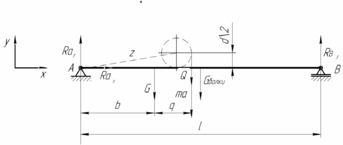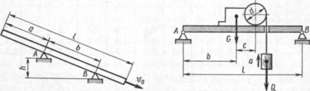 На однородной балке массой m=3т (рис.8.5) установлена лебедка силой тяжести G=25кН, поднимающая на тросе, наматывающемся на барабан d=0.1l, груз силой тяжести Q=12кН с ускорением а=3м/с2. Определить нагрузки на опоры А и В, если b=0.4l, c=0.2l. Массу троса не учитывать.