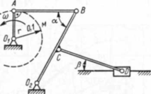 Задача 8.3 В механизме качающегося грохота (рис.8.3) определить угловую скорость кривошипа О2В=3r и скорость ползуна D при вертикальном положении кривошипа O1A, если АВ=CD=2r. Отношение BC/CO2=3/5, угловая скорость кривошипа О1А равна ω=6 рад/с, углы α=60º, β=45º. Длина кривошипа O1A равна r=0.1м.