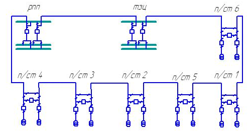 Вариант 3 представляет собой комбинированную сеть, в нем потребители 4,3,2 объединены в кольцевую сеть, а также в кольцевую сеть объединены потребители 6,1 включающие в себя РПП и ТЭЦ.