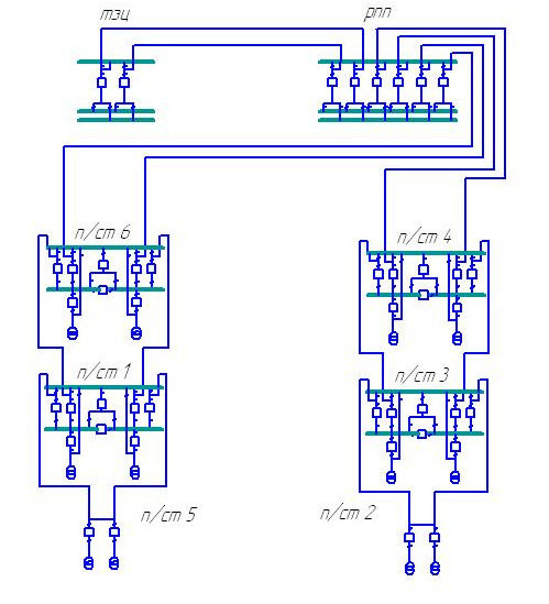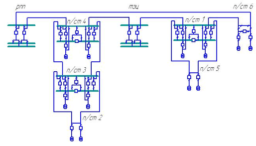 Варианты 2,3,4 относятся к одному принципу конфигурации сети. В них часть потребителей питается по кольцевой сети, часть – по радиально-магистральной. Среди вариантов этой группы сеть с наименьшей протяженностью линий является сеть, представленная вариантом 4.