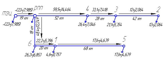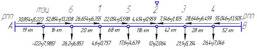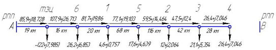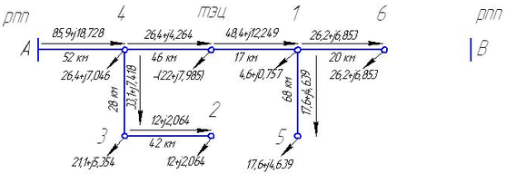 Поток мощности на остальных участках определяем аналогично. Результаты помещаем в таблицу 2, а также наносим на расчетную схему.