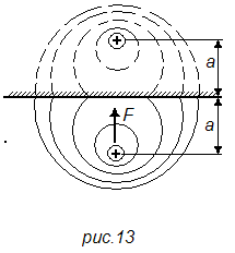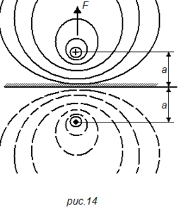 Если проводник с током находится внутри ферромагнитной массы (рис. 14), то те же силы будут отталкивать его от границы раздела. Картина поля, а следовательно, и сила взаимодействия будут такими, как если бы за пределами ферромагнитной массы на таком же расстоянии был расположен проводник с таким же током, но обратного направления. Значение силы определяется тем же уравнением (50).