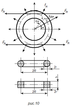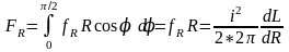 Для того чтобы найти силу FR, стремящуюся разорвать виток, необходимо проинтегрировать проекции радиальных сил, действующих на четверти витка. На элемент окружности витка Rdφ действует сила fRRdφ, проекция которой на ось х равна fRRdφ cos φ, откуда