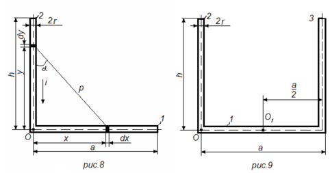 На рис. 8 и 9 приведены часто встречающиеся в аппаратах формы перпендикулярно расположенных проводников, например в рубильниках, мостиковых контактных системах и многих других аппаратах и узлах. Произведя расчеты, аналогичные предыдущим (первый метод), получим следующие выражения для сил, действующих на проводник 1 по рис.8