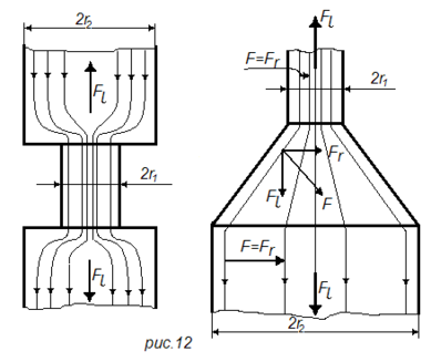 При изменении сечения проводника линии тока искривляются, и кроме поперечной Fr появляется продольная составляющая Fl стремящаяся разорвать место перехода вдоль оси проводника. Эта сила всегда направлена в сторону большего сечения и равна