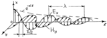 , соответветственно здесь плоская электромагнитная волна распространяется как в реальной среде, а в реальных средах, в отличии от свободного пространства потери волны возникают по двум причинам. Во-первых, потери связаны с конечной проводимостью среды (потери на джоулевое тепло), во вторых, потери возникают из-за явления поляризации диэлектрика, которое в конечном счете также приводит к тепловым потерям. Характер потерь можно оценить вычислив отношение модуля плотностей тока проводимости и тока смещения: