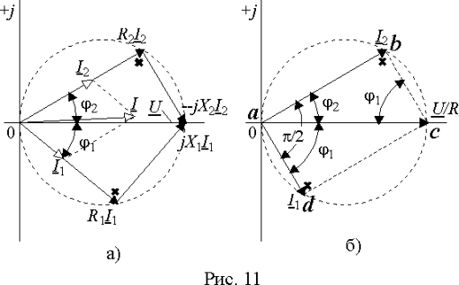 Ветви контура соединены параллельно и общее падение напряжения на них одинаково и равно сумме падений напряжения на элементах ветви. При любых изменениях частоты угол между напряжением на резисторе и реактивном элементе составляет 90° и т.к. сумма их постоянна и равна входному напряжению, то геометрическим местом точек конца вектора падения напряжения на резисторе будет полуокружность (рис. 11 а)). Причем, векторы ветви с индуктивностью будут вписываться в нижнюю полуокружность, а ветви с емкостью - в верхнюю. Входной ток I равен сумме токов ветвей I1 и I2 и резонанс наступает, если его направление совпадает с вектором входного напряжения U.
